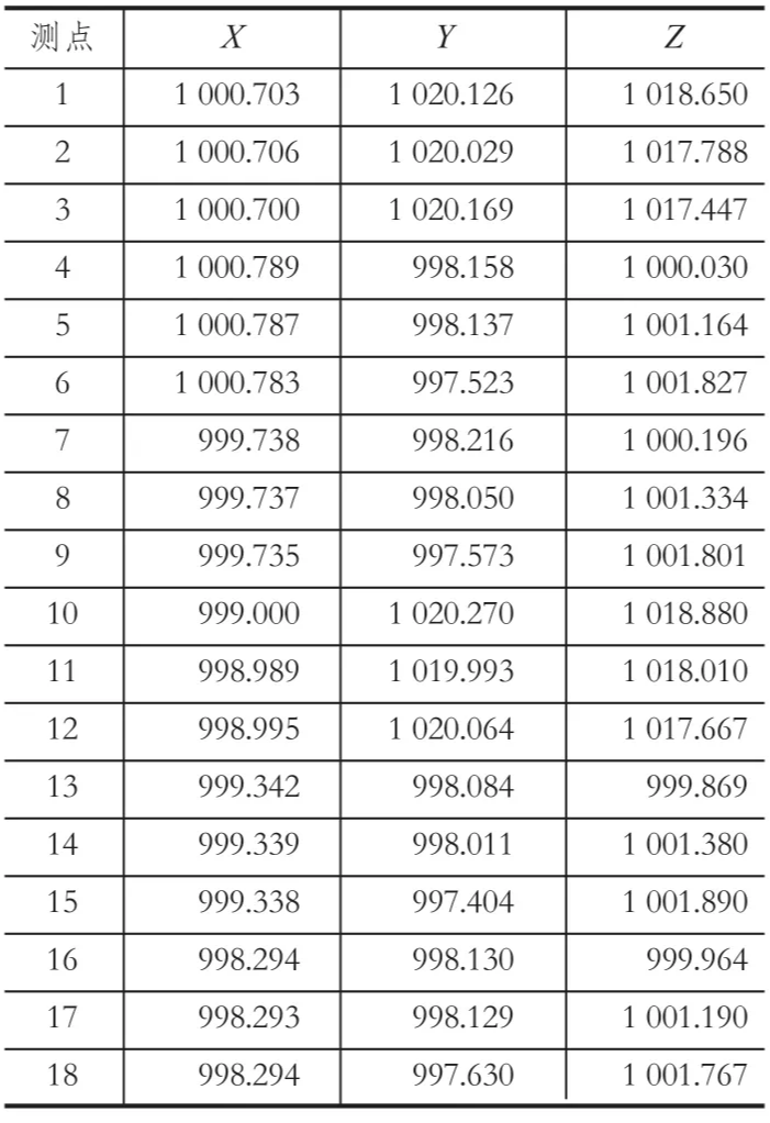 在機房內(nèi)選擇通視條件良好的位置架設(shè)全站儀,建立假定坐標(biāo)系,取測站坐標(biāo) O(1000,1000,1000),在每個天輪繩槽中間測定 1 組數(shù)據(jù) (每組 3 點),共測定 2 組;在卷筒擋繩板兩側(cè)內(nèi)壁各測定 1 組數(shù)據(jù) (每組 3 點),共 4 組。測量的數(shù)據(jù)如表 1 所列。表中,測點 1~ 3 為 1 號天輪實測坐標(biāo),4~ 9 為 1 號天輪對應(yīng)坐標(biāo),10~ 12 為 2 號天輪實測坐標(biāo),13~ 18 為 2 號天輪對應(yīng)坐標(biāo)。