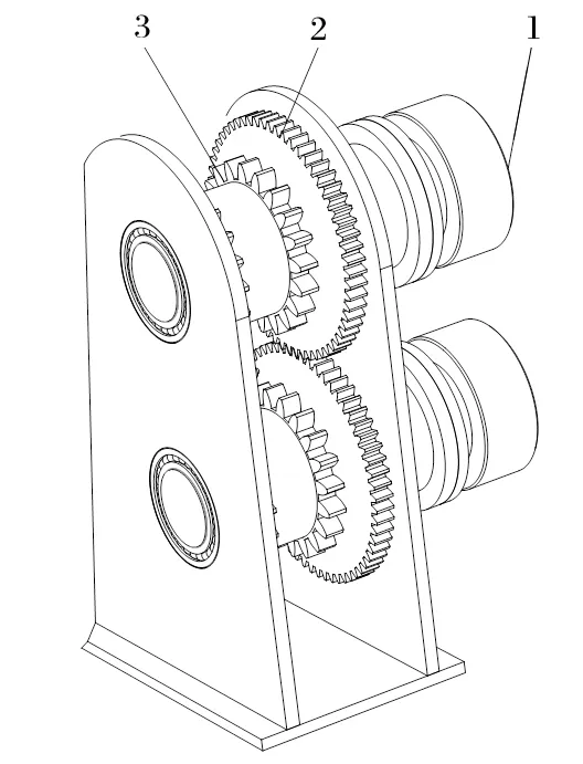 針對雙液壓馬達(dá)在工作過程中出現(xiàn)速度不同步問題,在連接鏈輪的軸上加裝一對同步齒輪,使兩個(gè)鏈輪速度強(qiáng)制同步。送繩機(jī)構(gòu)的局部結(jié)構(gòu)如圖2所示。